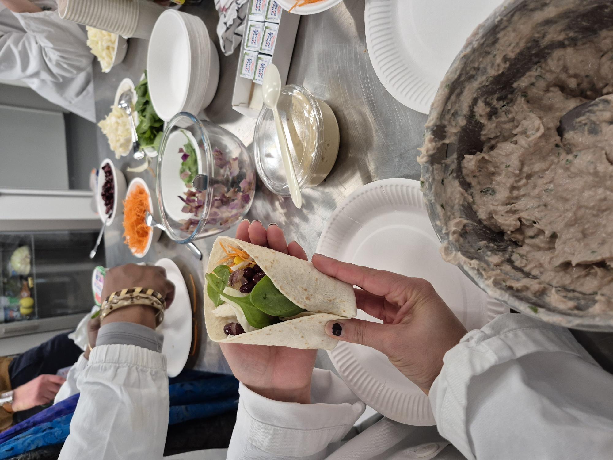 Les participants composent leurs wraps avec des légumes frais, des sources de protéines, des sauces maison. On ajuste, on goûte, on échange des idées.